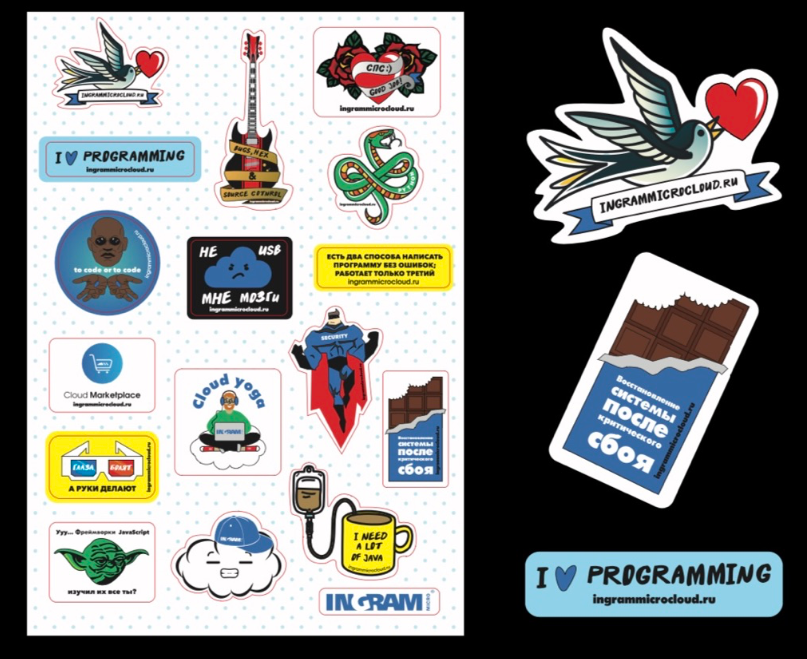 Стикеры для мерча и соц. сетей обычно поддерживают основную коммуникацию рекламной кампании, но могут быть и самостоятельной "продукцией".